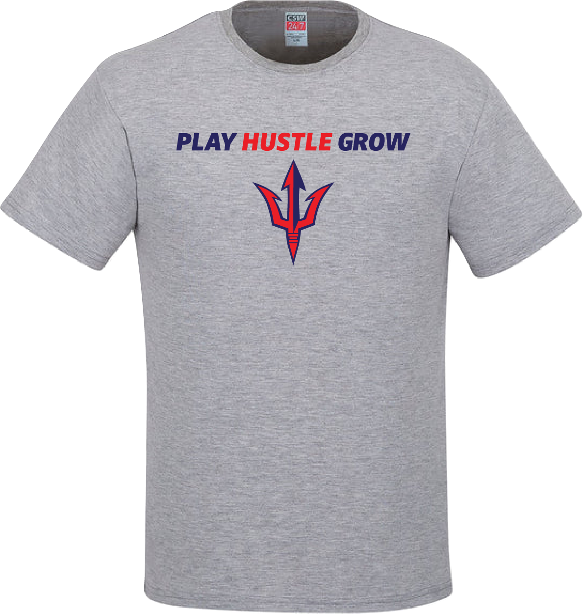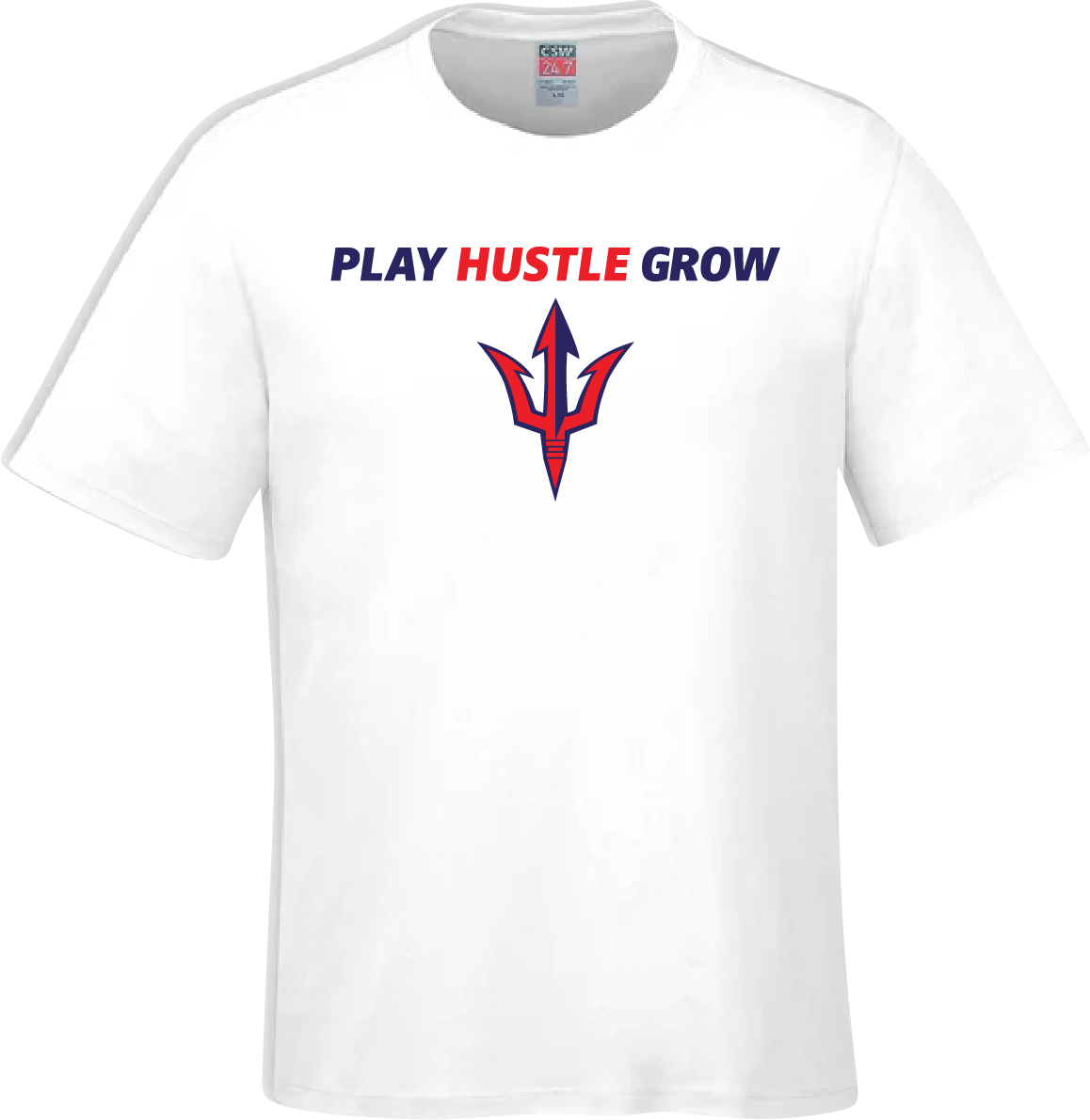 Cotton Tee with the Play Hustle Grow logo on the full front