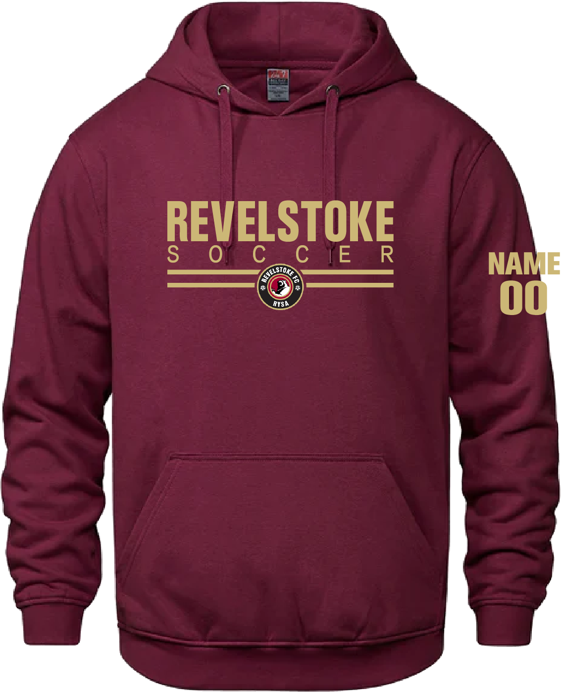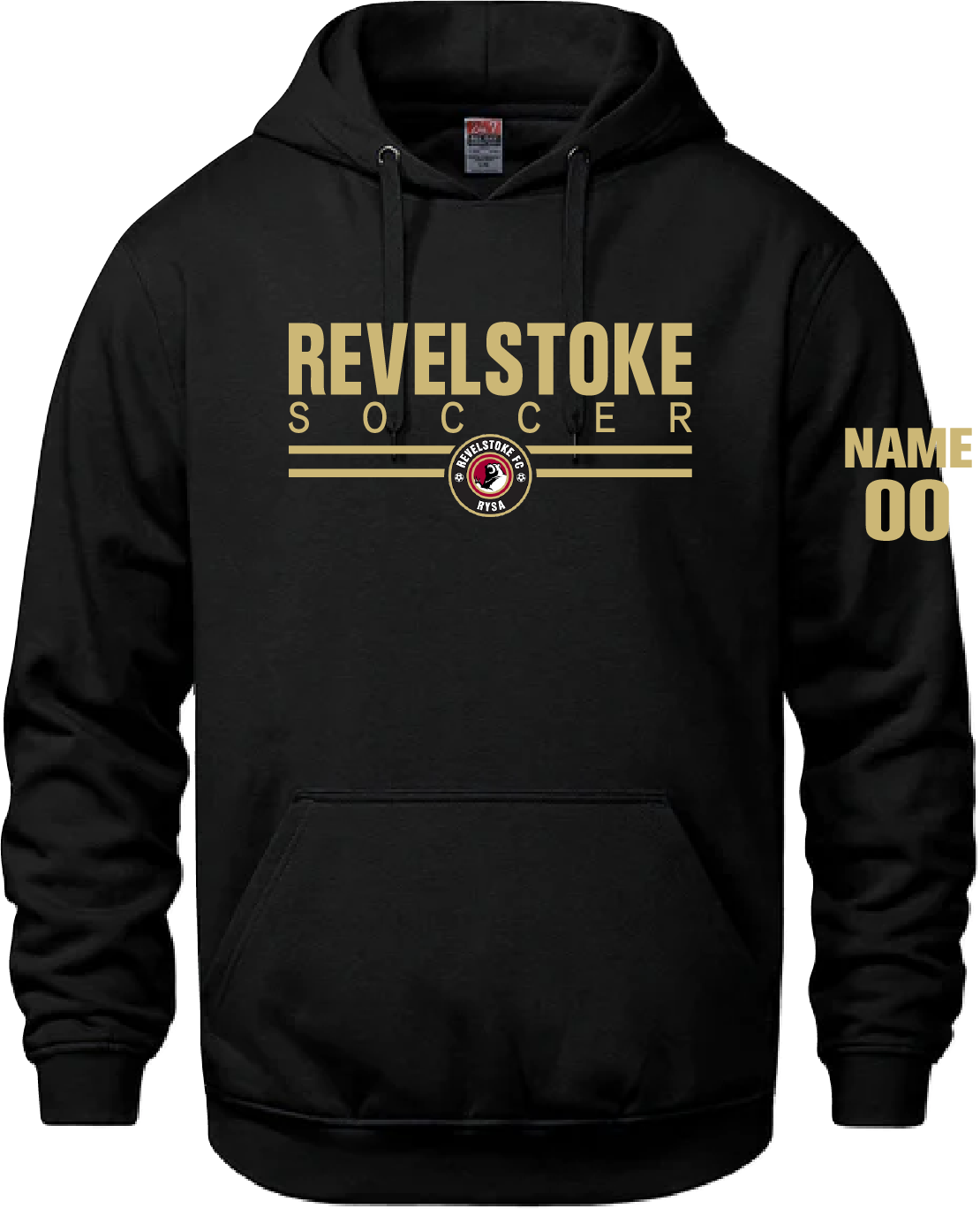 Cotton/poly blend unisex pullover fleece hoodie with the Revelstoke Soccer Logo printed on the front.