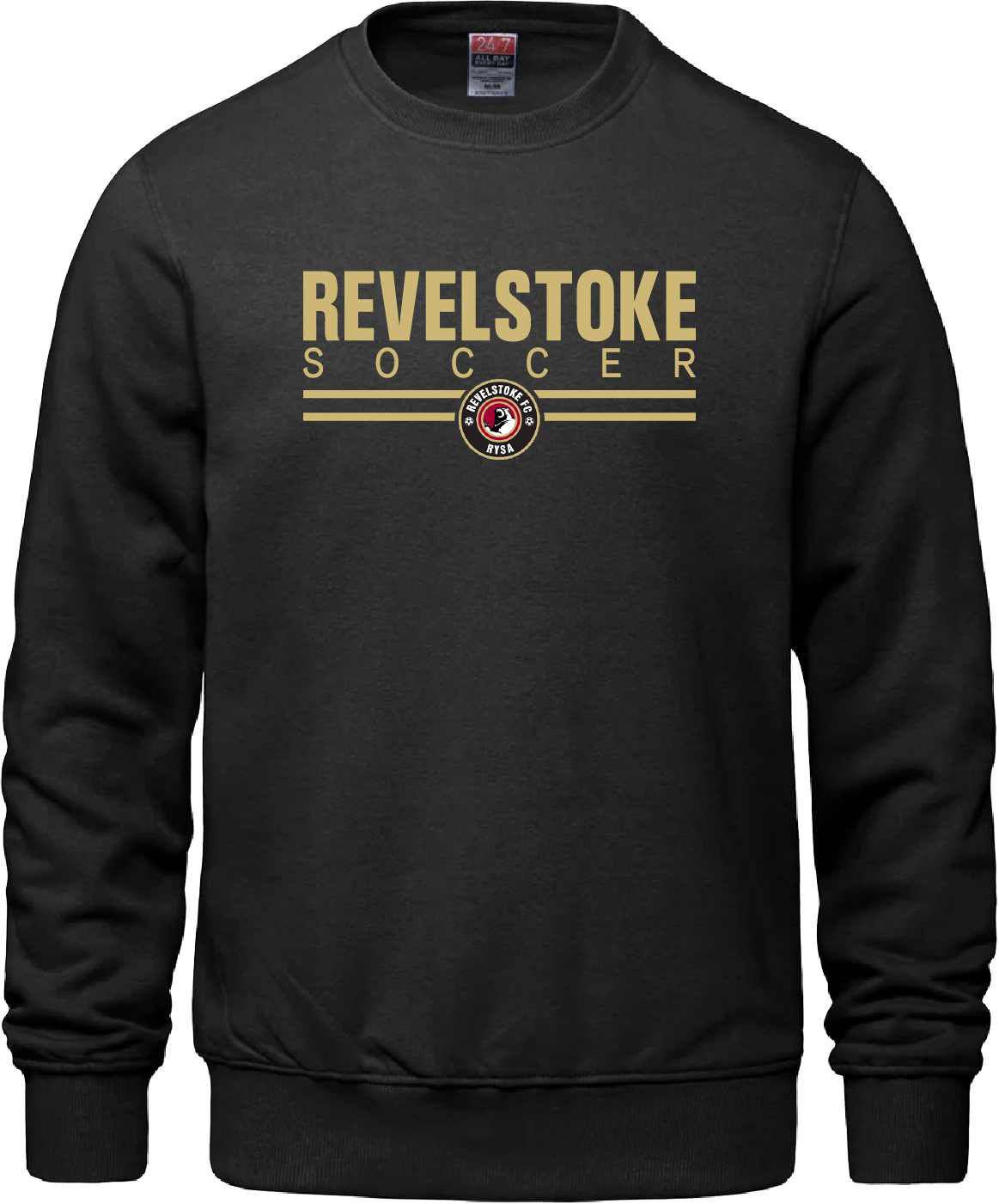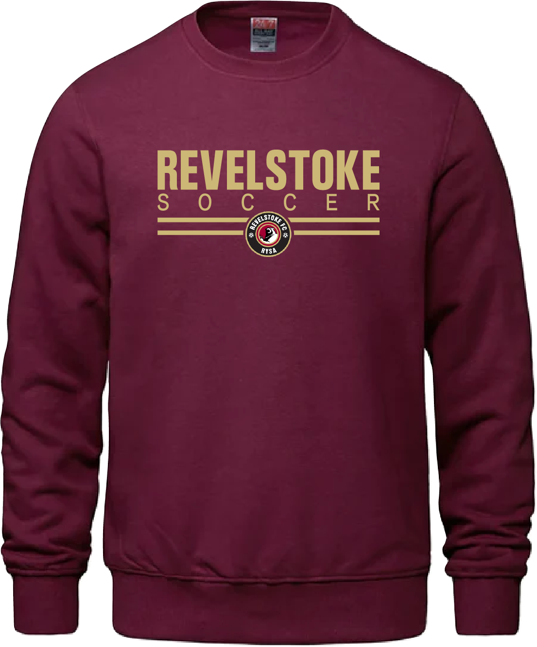 Cotton/poly blend unisex Crewneck Sweatshirt with the Revelstoke Soccer Logo printed on the front.